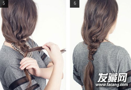 编好的发辫与另外两部分头发,一起进行三股辫编织即可。