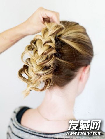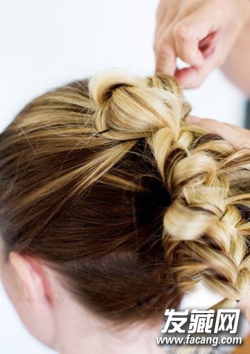 Step 7: 还记得开始时我们绑的3个辫子吗?虽然它们已经被编成1条的,但是绑着它们的3个橡皮筋还在哦!那么,我们翻一翻,找出最上面那个橡皮筋的所在位置,并用手将其抬高,用发夹将其加紧并固定住,这样是为了将那橡皮筋“隐藏”得更好。