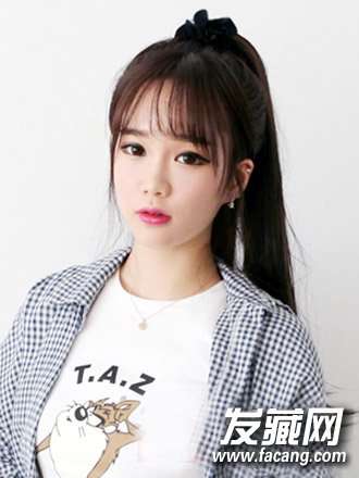 将黑色的长直发扎一个顺滑的高马尾,清爽大方,带个发饰来修饰,前额是烫出的薄碎的空气刘海,格外轻盈俏皮,超级适合学生妹的发型。