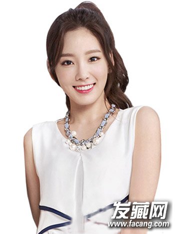 很有活力气息的一款简单马尾辫扎法,蓬松的卷发扎活力十足的高马尾辫发型,露额扎发前额留出鬓发修颜,甜美清新。