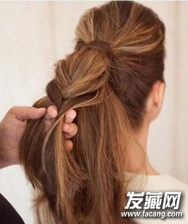 5.在马尾最上层分出三束头发,用来编麻花辫,然后依次从两侧各自加入新发进行编织。