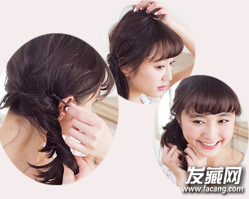 step1:将头发拉扯到右侧后扭转成发辫,再用发夹固定。