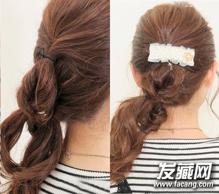 step7:最后将所有的头发拉扯到左侧固定在一起即可。带上喜欢的发卡,这样一款清纯可爱的马尾辫发型就扎好了。