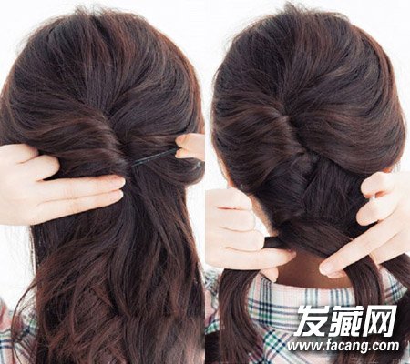 step1:取出上半部分头发扭转成内扣发辫后用发夹固定。