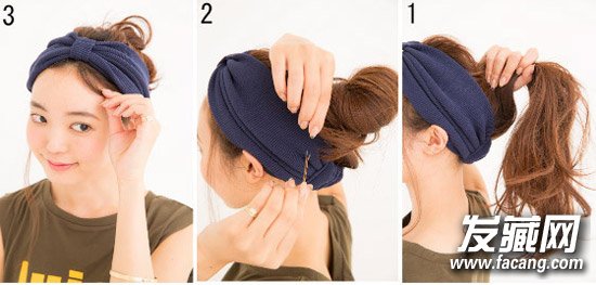 step1:戴上头巾后将头发绑成高耸的马尾。
