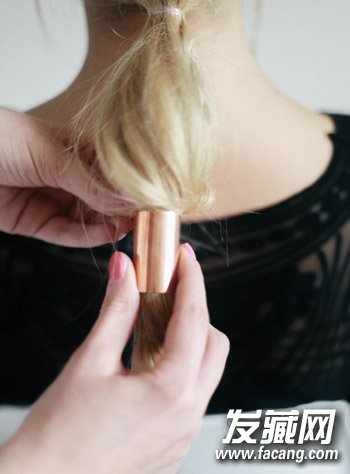 4、将扎好的马尾辫从根部开始穿过发圈。