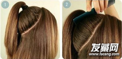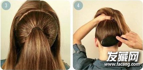 然后,将剩余的头发与“圆”马尾融为一体,因为马尾够高,我们不用再将头顶挑得过于蓬松,反而可以用宽齿梳梳理发顶与后部的头发,抚平头发的毛躁。