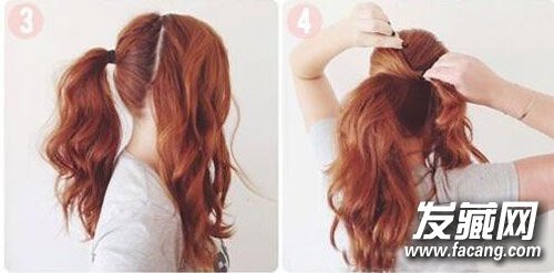 然后,和上一招一样,扎出一个“圆”马尾。不同的是,这里将余下的头发分成左右两部分,将左半部分的头发拧成一股缠绕在马尾上,用U形夹固定。右半部分也如图所示。