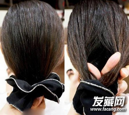 2、接着将大肠圈绕一圈后,利用两支手指头在发中挖出个洞口。