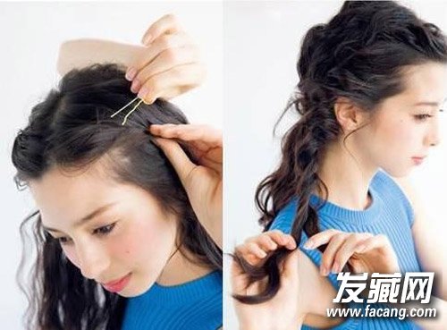 Step 1:将卷发侧分然后刘海处取两小束头发向后扭转用U型发夹固定。