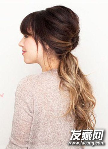 给大家介绍一款颇具淑女风的齐刘海公主式马尾扎发造型,上层的头发高高梳成公主发拢,蓬松有型,下层的头发自然呈现卷发样式,色彩的搭配更是这款淑女发型的亮点,上层头发是黑色,下层头发是金黄色,深浅色搭配,造型华丽优雅。