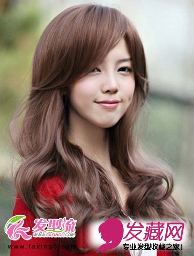 栗色的染发给人一种神秘浪漫的色彩,斜刘海自然拨到右侧微微遮住眉毛和眼角为妩媚增添一些色彩,中卷波浪侧分两边自然垂落至肩,几处发丝外翘彰显MM跋扈的个性,整个斜刘海烫发配着枚红色服饰女人味尽显出来。