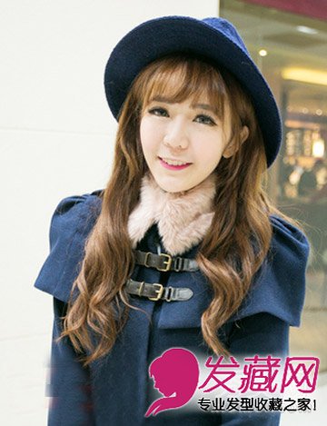 漂亮的韩式空气感刘海衬托的一双大眼睛忽闪忽闪的,亚麻棕色卷发也是非常具有暖意的冬日发型,自然披肩的发型戴上蓝色的大礼帽,时尚简约名媛范十足。