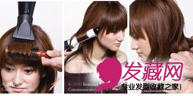 Step 1 电吹风贴近刘海 发根,进行热吹风。营造出向外拱起的圆润弧度。以脸沿线为界,将刘海与两侧头发区分开。