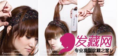 Step 4 黑羽发带从右侧开始缠绕,遮盖住左侧发辫的结点。同时补正左侧发量,从视觉上看与真发融为一体。