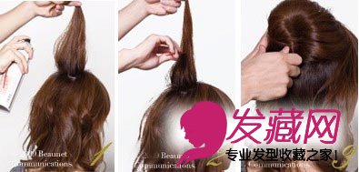 Step 3 收拢后侧的外层发片,逆时针旋转成一股发束并向上托起,营造出高高隆起的顶部发区。再从两侧提取小股发束盖住,分别用发卡固定。