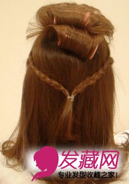 把两边全部都用三股辫的小编发放在一起,最后再在后脑中间的部分让两者结合起来。