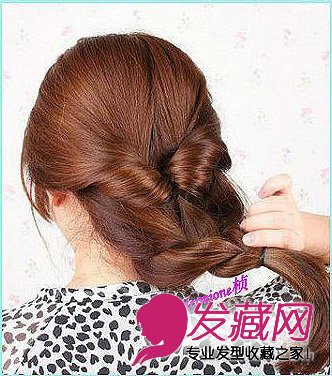 首先把头发分成2部分,上面的扎一个小辫,然后在皮筋处挖个洞,把头发从洞中翻过去。再把地下剩下的头发编成麻花辫,如图。