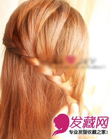 接下来再按照加股辫的编法,每编下一节的时候,去一束上面的头发加入。方向是从左至右,斜着下来。如图
