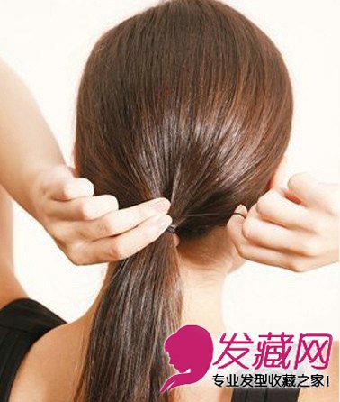 step3:将马尾分成两股,其中一股再分成两股,将两股头发进行扭转。