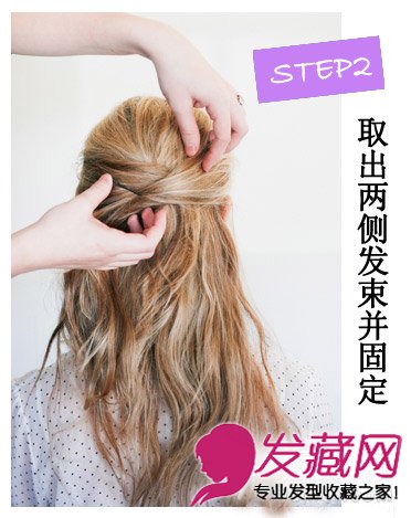 step2:再从前额左右两侧各拉出一束头发,交叉后用黑色发夹固定。注意哦,黑色发夹需要从底部斜夹过来,这样会更精致。
