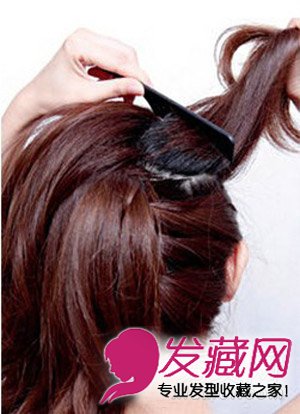 step3:将后面的头发由下至上编三股续辫,一直编到分区的地方,用发圈固定,将上区的头发从右到左分层,首先用梳子倒梳头发将发根打蓬松。