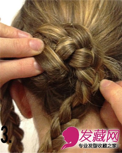 STEP 3 将下面那股麻花辫向上沿着发辫的第一步的那个点为中心顺时针旋转缠绕,这里要注意要有纹理的旋转缠绕,出来的效果才会好看。