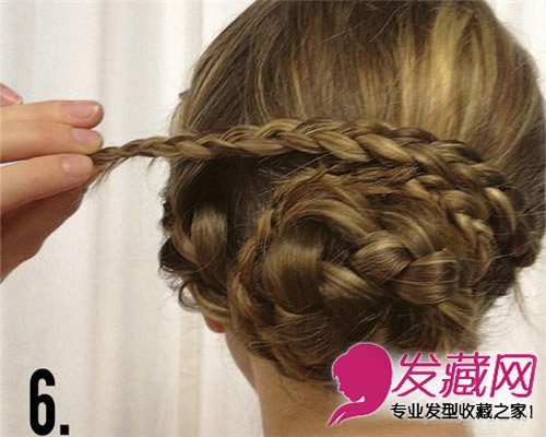STEP 6 右边那条麻花辫跟左边的麻花辫一样环着相同的方向围着发髻缠绕,最后也是用一个小发夹固定好,这里要注意尽可能的绕城一个圆形的盘发,整款发型就完成了。