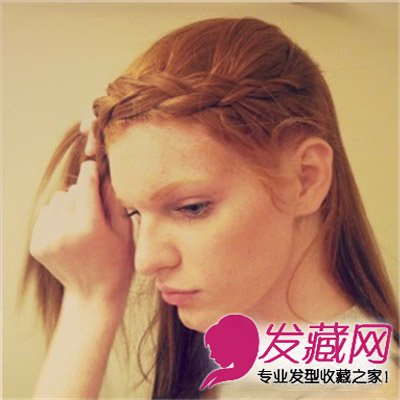 STEP 2 然后沿着额头曲线将刘海编成麻花辫,同时每步完成要加入新的发束。