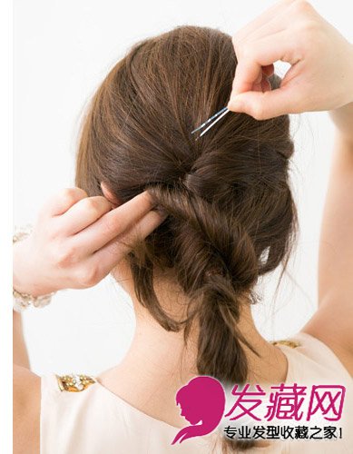 step7:将发辫从脑后的马尾下方穿过拉扯到头顶上方,用黑色发夹固定。
