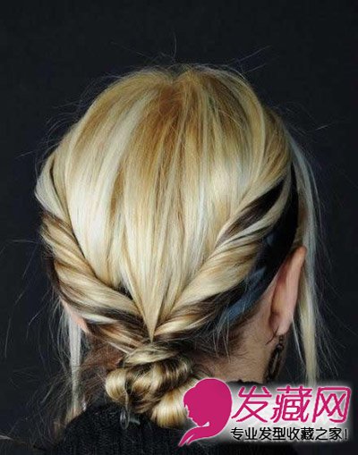 很有欧美范儿的这款盘发,取两侧头发向内卷最后在马尾出打结,两侧的头发尽量卷的精致有型一点。