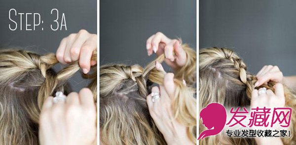 以三股辫的编织方式进行编织:将左侧的头发叠加在中间的头发上,两者的交叉使之成为新的中心,再将右侧叠加在其之上。按照这样的编发方式重复编织两至三轮。