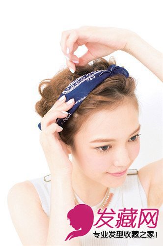 把印花手帕后侧的发束向上抽拉以制造空气感。前刘海也弄松调节平衡。