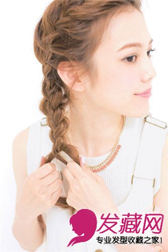 把全部头发粗略对半分开后紧紧编起。从耳下到发梢部分编成三股辫。
