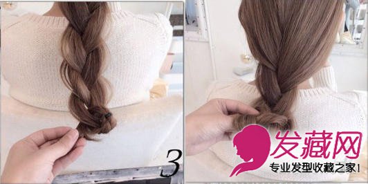 把发尾从上一个麻花的环中穿过,然后把整个麻花辫慢慢向上卷。