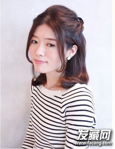 留出刘海的造型修饰脸型,简单的将头发扎出披肩式的扎发造型,中发的披肩制造出邻家女孩的气质感。