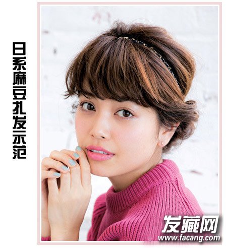 发型点评:不喜欢烦乱刘海的MM可以试试将刘海扎起来,将刘海与脸颊旁的头发扭转成发辫后固定在耳后,展现出清爽的脸蛋。微卷发甜美俏皮。