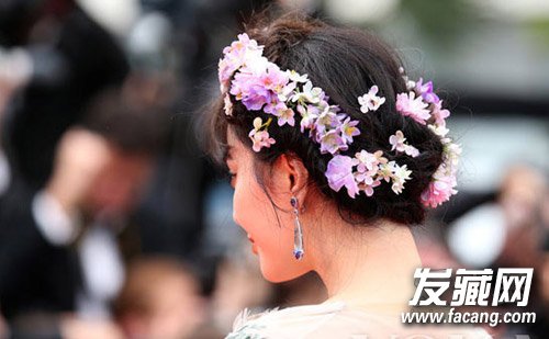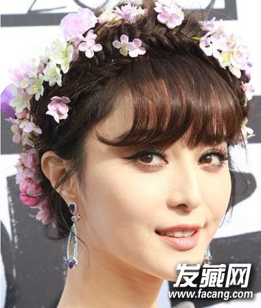 前额松松的长刘海被烫出了内扣效果,发丝松松的很透气,让眉毛若隐若现。仔细看一下,范冰冰的头顶有根用自己秀发编出来的细麻花辫,既起到固定作用,又能在花朵的装饰下显示出精致的细节美感。