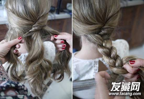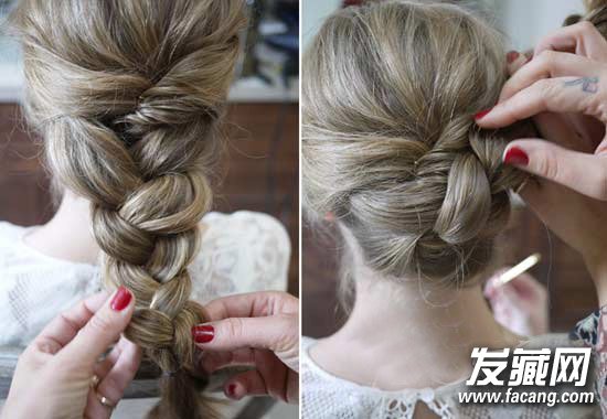用手指把辫子拉松,之后朝上方编织成一个发髻;