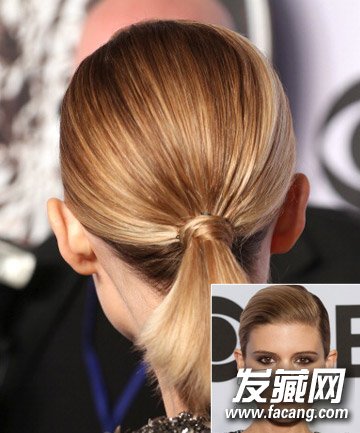 将头发梳光滑后在脑后扎紧,并留出一绺用来包住发箍的部分。