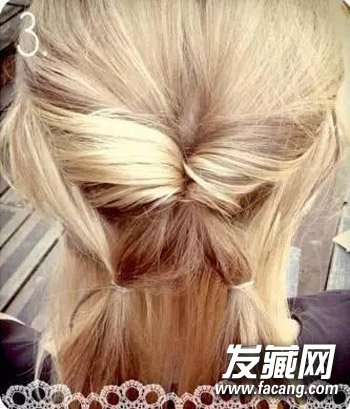 Step 3:将第二层的头发分为左右两部分,翻转后的发束也分为相同的两部分,分别和下层的头发绑在一起。