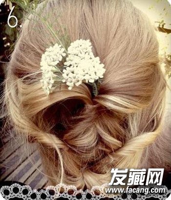 Step 6:最后将发型稍稍调整一下可以用手拉蓬松一些,然后插上花朵,这样一款很有气质的盘发发型就完成了。