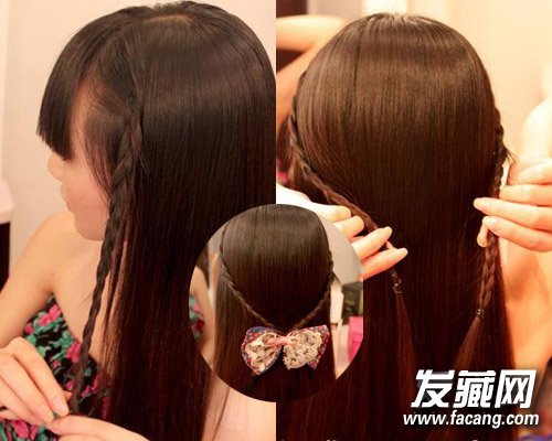 然后把编好的的麻花辫拉到一起,可以拧一下,再扣上发饰,非常简单。