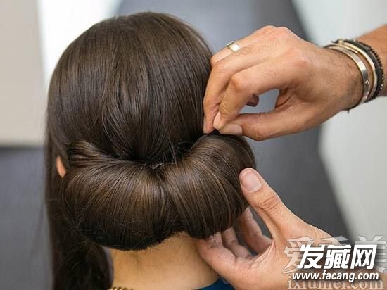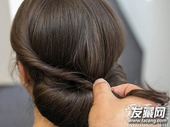 5、扭转预留在耳前的头发,将其绕到后方的发髻之上交叉,并用发夹固定。