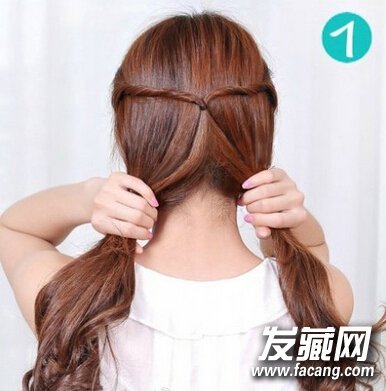 先从两边各挑一小撮头发绑成两股小辫固定在头部的中央,固定好之后就把全部的头发,包括刚绑好的两股小辫分成两股。