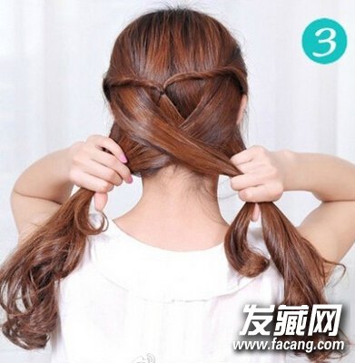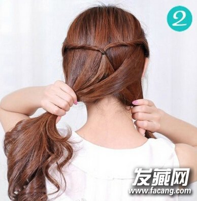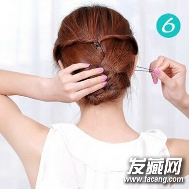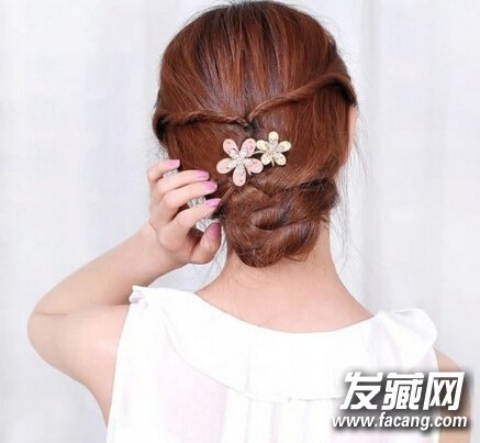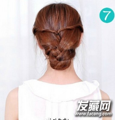 把编好的麻花辫对折向发型的里面藏好,固定在中央扎的那一小股头发里,这时候一定很多美眉说很难固定,只要你在步骤一用的橡皮圈扎得稍微宽松点,就会有位置把麻花辫固定好。