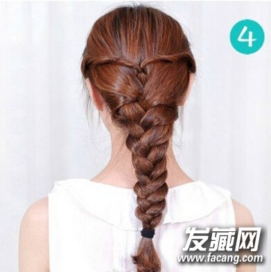 依次类推,将分股交错的四份头发顺着头发的长度进行麻花辫,一直编到发尾,然后用橡皮圈把头发固定好,这是一个独特的麻花辫造型就出来了。