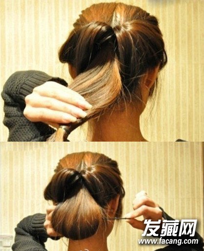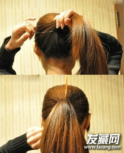 【韩式盘发教程step02】接着,把尖齿的盘发器从马尾的前方由下往上的穿过(如图)再使劲将马尾的秀发穿过里侧往下拉(如图)