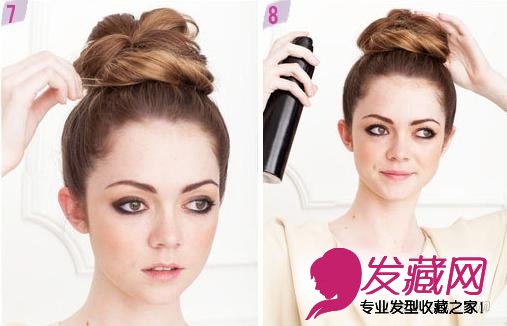第七步第八步发卡固定后,再稍稍整理下凌乱的发梢,用定型产品使发型固定。