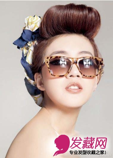 精心吹起的高发髻颇显个性、夸张,略带有一丝年代感,后面的头发扎成一个随意的马尾又显得摩登现代。中间用丝巾完美过渡,让两者融为一体,使这款发型成为各位复古名伶的最爱!从正面看被做高的前额发可以有效地修饰脸型,在视觉上变得窄瘦。